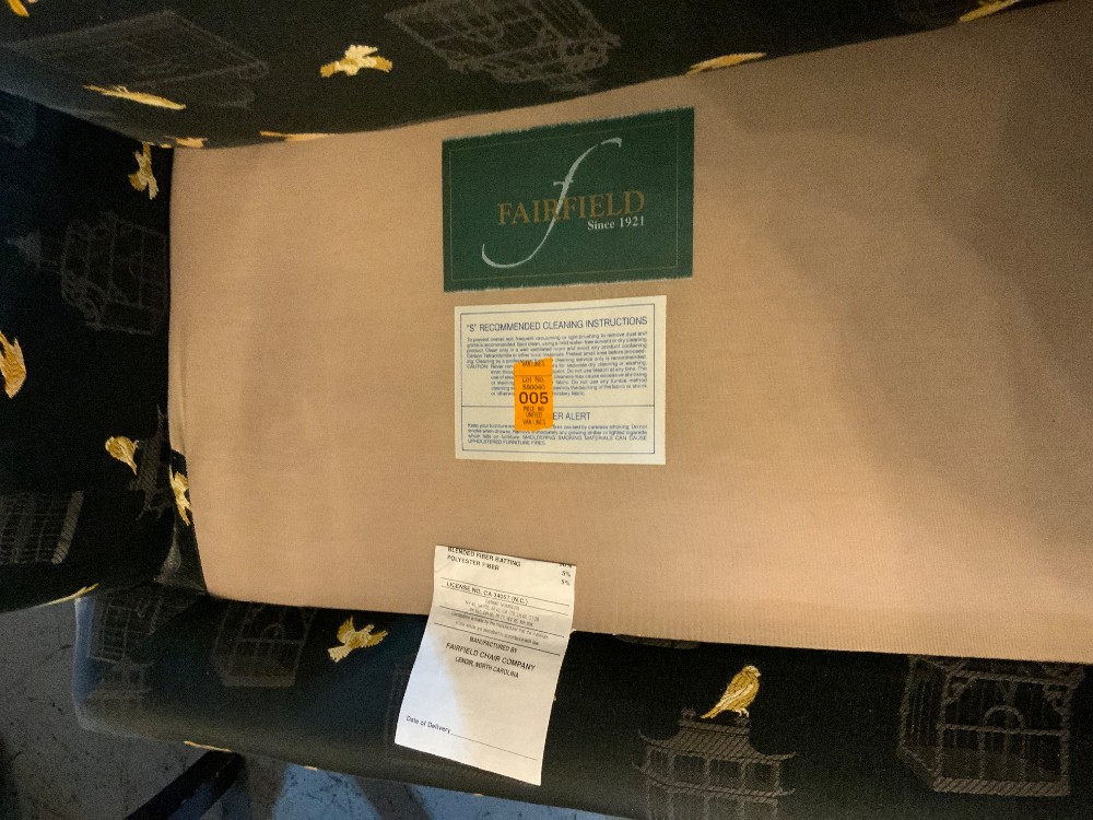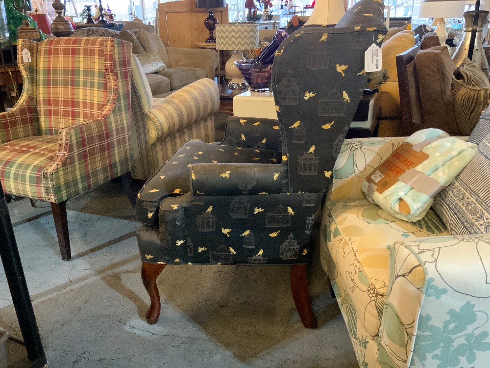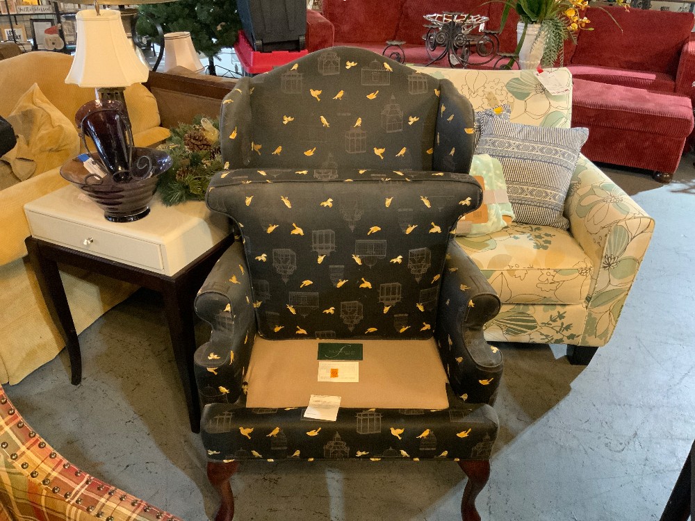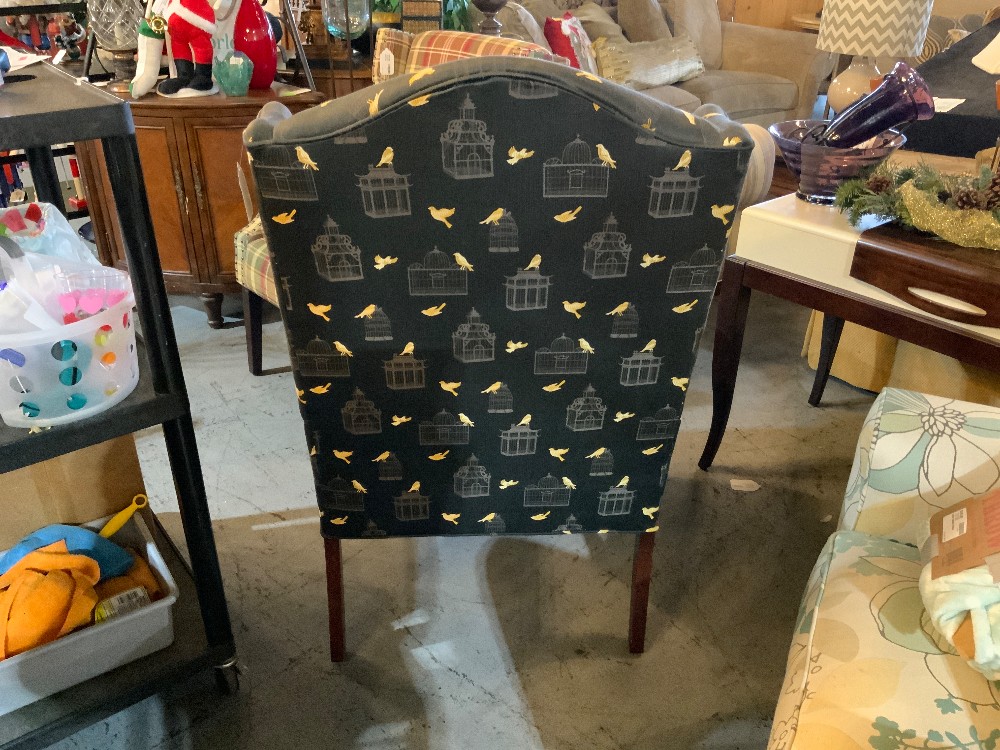 Dark blue/black wingback chair with gold bird and grey bird cage designs and wood legs Removable cushion 27.5” wide x 28” long x 43.5” tall
