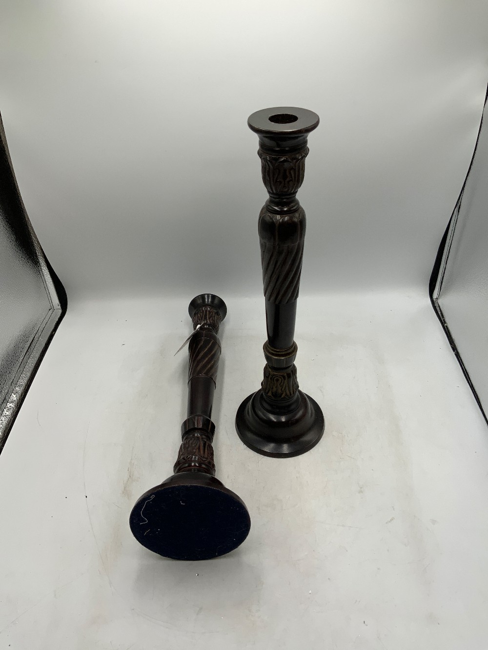 Two brown, metal candle stick holders with blue felt on the bottom. A little under 15 inches tall, base width of 4.5 inches, top width of 2.3inches.