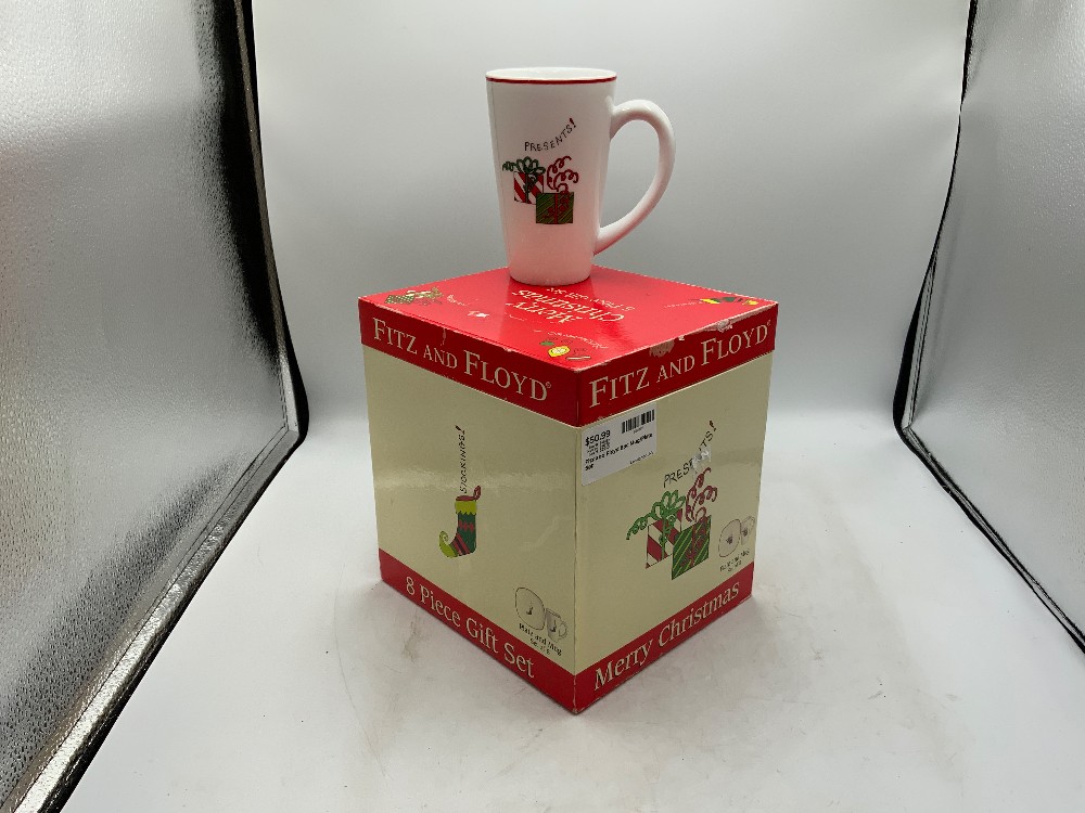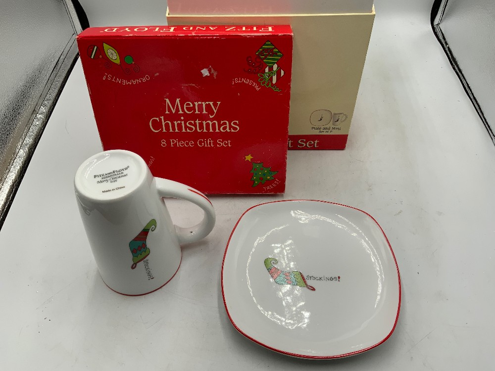 Fitz and Floyd Christmas 8 piece gift set 4 mugs & 4 plates with phrases/ pictures of stockings, presents, trees, and ornaments Plates ~6.5” x 6.5” Mugs 5.25” x 3.25”