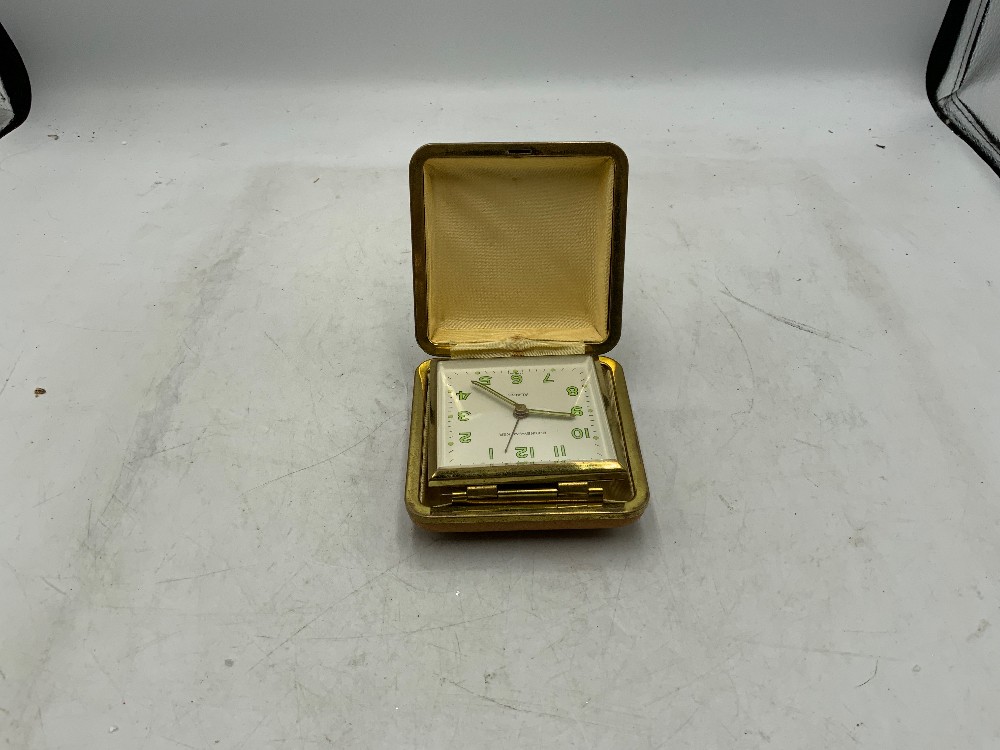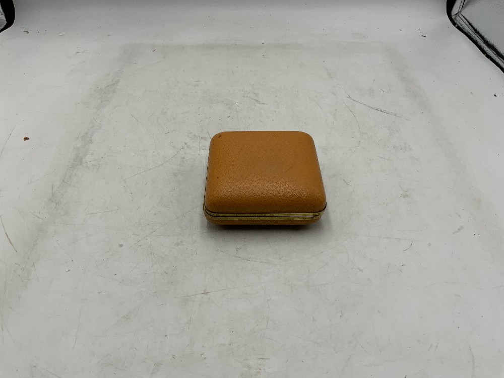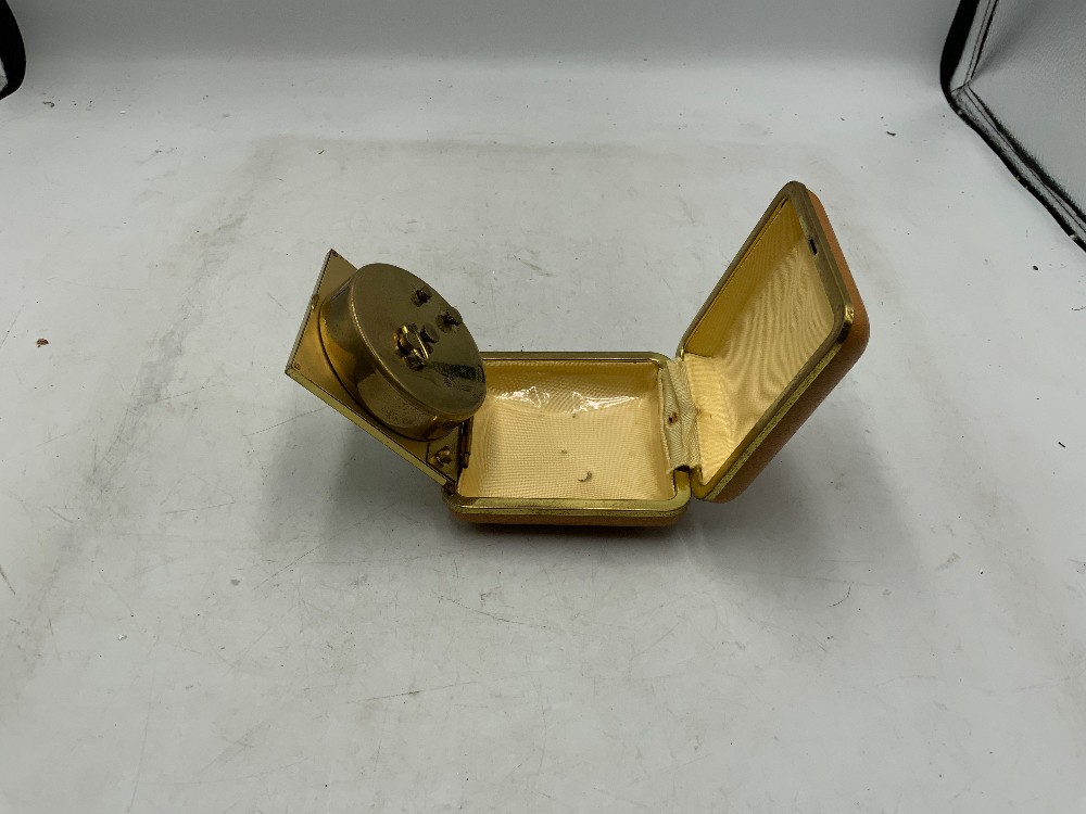 Phinney-Walker mid century travel clock in orange leather case 3.5” x 3.5” x 1.5”