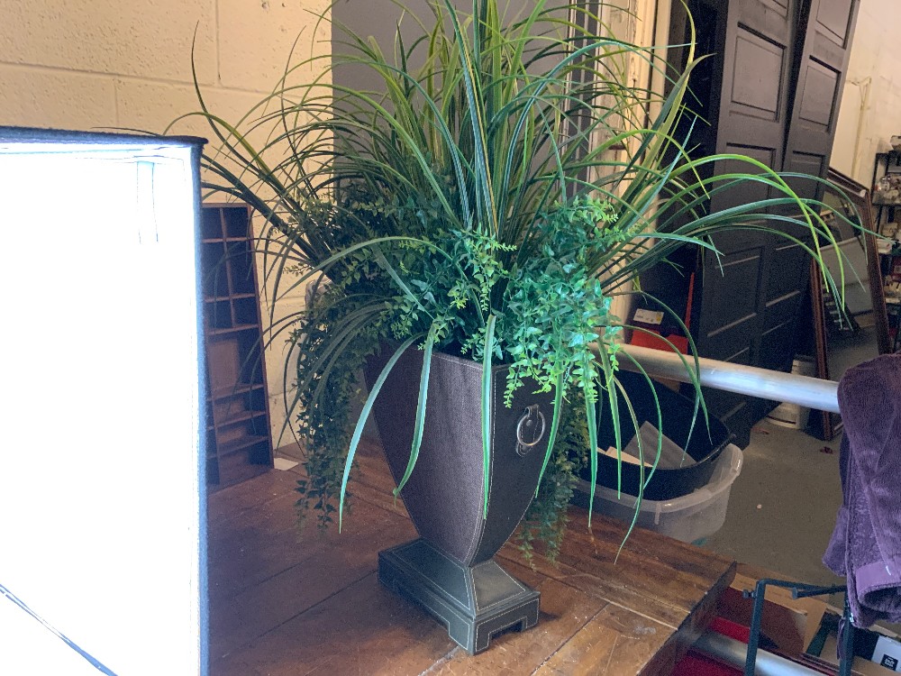 Greenery floral in organizer box/vase Vase 11.5” wide x 5” long x 15.5” tall Total ~ 21” wide x 11” long x 29” tall