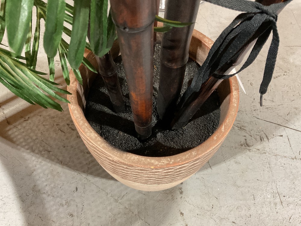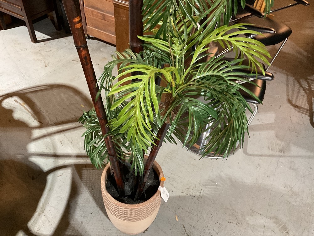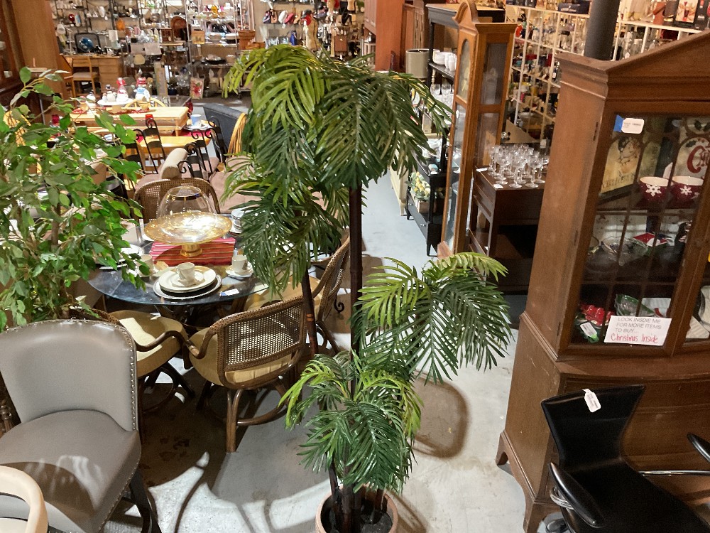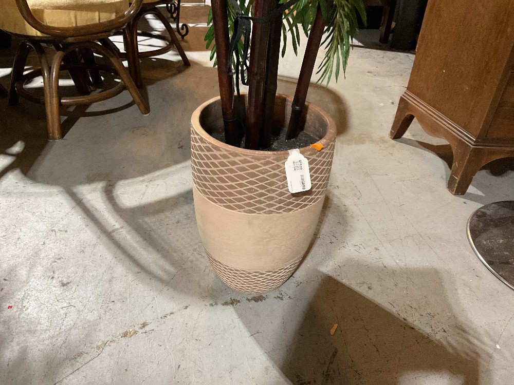 Faux tree in a planter Plastic leaves, tan resin planter with diamond etching design, black styrofoam as faux soil 6’5 tall x 2’6 / 30” wide Planter 17” tall x 11” wide