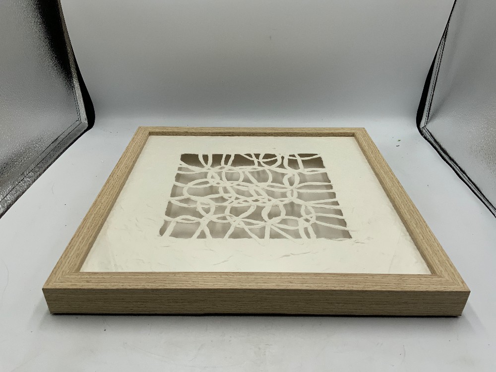 White rice paper shadow box wall art in light wood frame 14.2” wide x 1.4” long x 14.2” tall