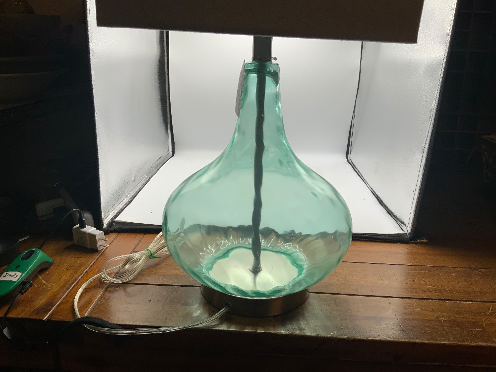 Lamp with glass base and cream shade 24.5” tall x 15” wide Base 11.5” wide