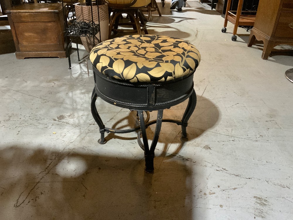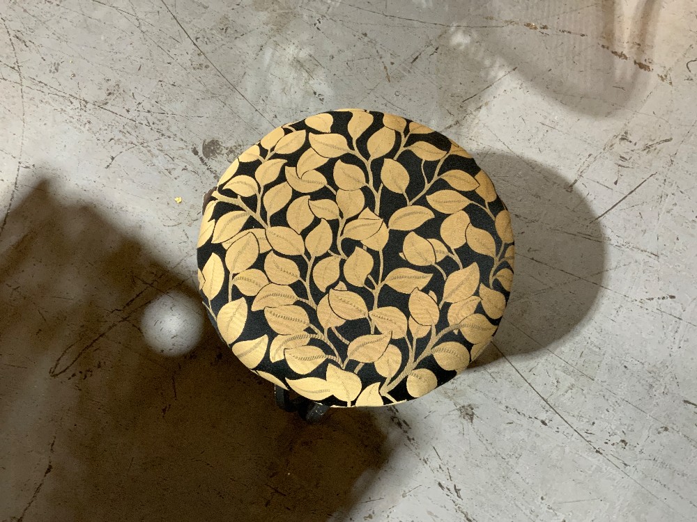 Upholstered stool with black metal frame Gold leaf design 17.5” x 17.5” x 18” tall