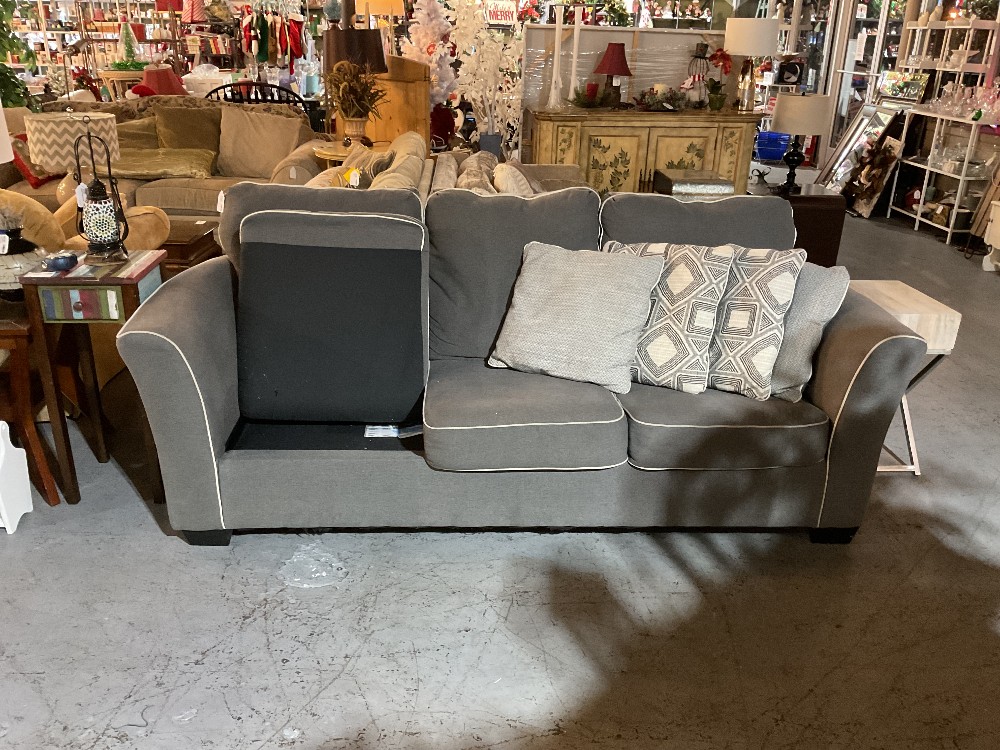 Grey 3 person sofa with 4 pillows Removable cushions 91” wide x 36” long x 38” tall