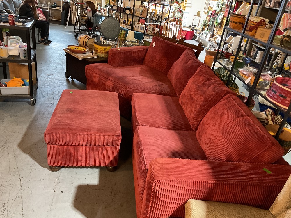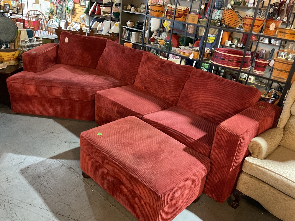 Red 3 piece sectional sofa with ottoman About 140” wide x 64” long x 36” tall Ottoman 39” wide x 26” long x 18” tall Corner piece about 64” wide x 53” long